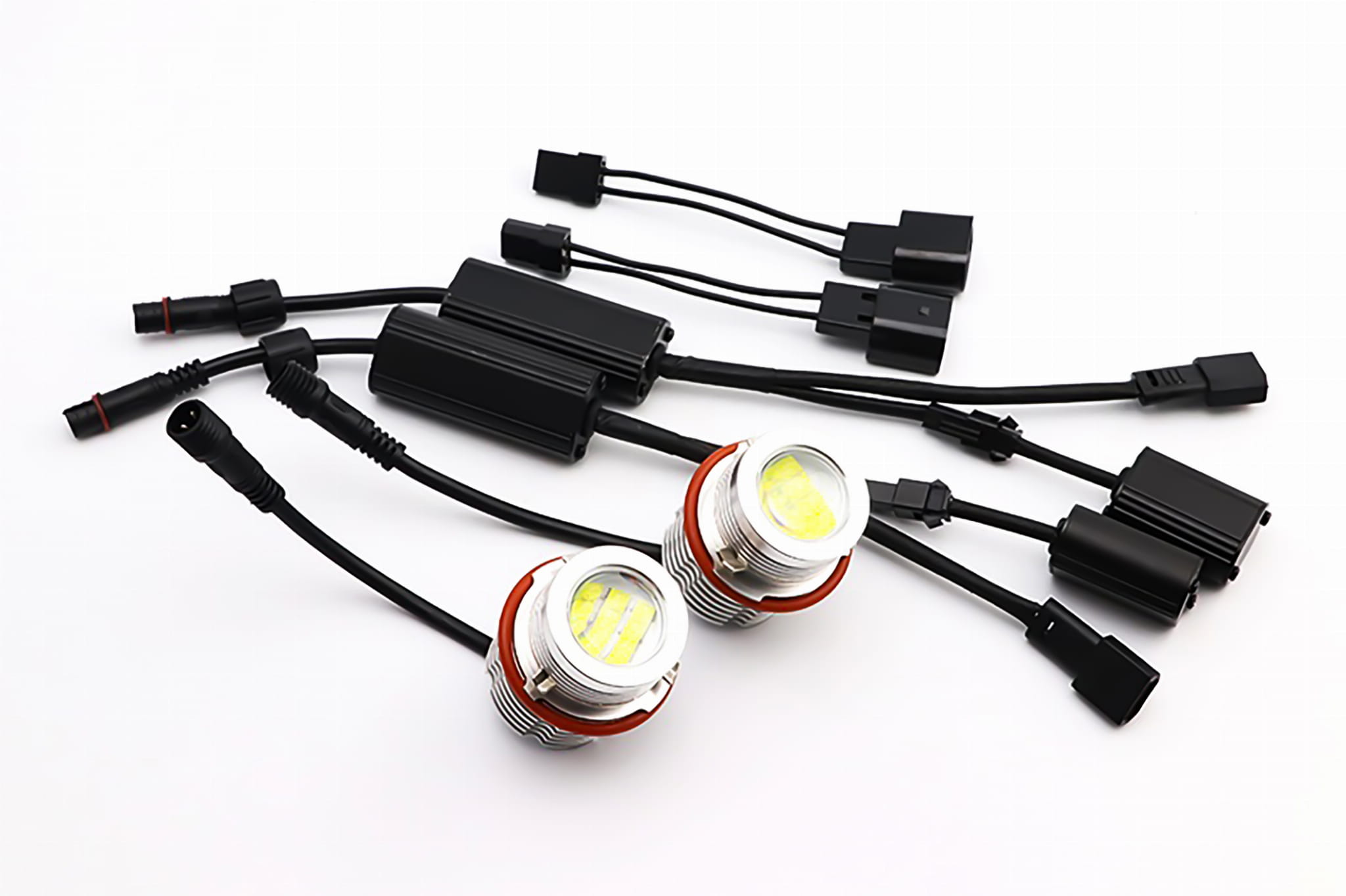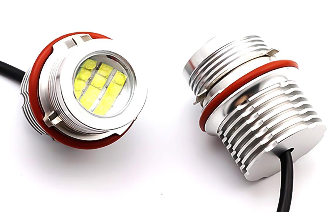 Żarówki LED wraz z oprawkami oraz zestawem przejściówek, tzw Angel Eyes (oczy anioła) - zmieniają barwę światła z tradycyjnych żółtych (halogen) na białą zimną barwę (LED)